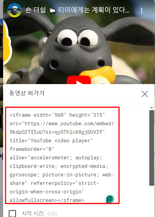 가져오고 싶은 유튜브 영상에서 "공유" 버튼을 누른 후 "퍼가기"를 선택합니다.